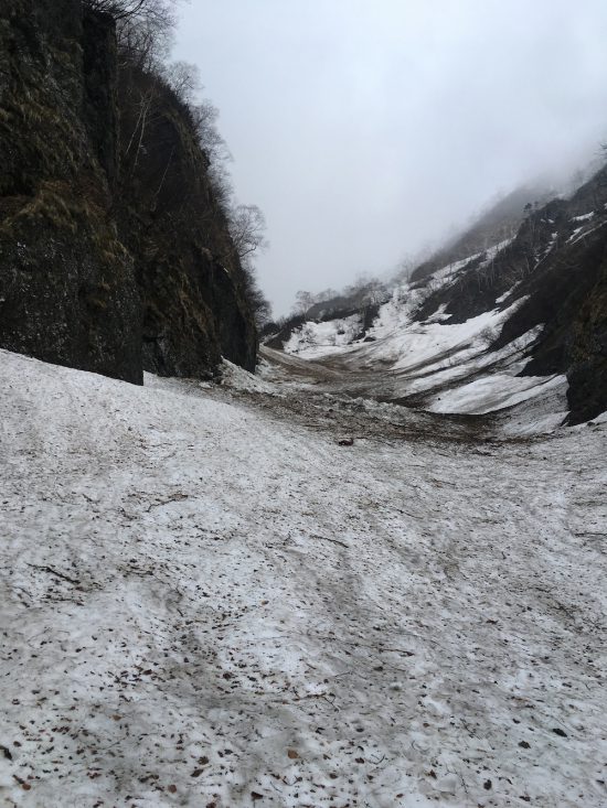 残雪期ならではの5月、雪渓にうまった本谷は山頂まで一気にアイゼンでつめる好ルート。道内には少ないアルパインムードのする山です。週末は暑いくらいの土曜と小雨まじる日曜日、あいにくの小雨で本谷もガスの中でしたが山頂まで詰め同ルートを下りてきました。