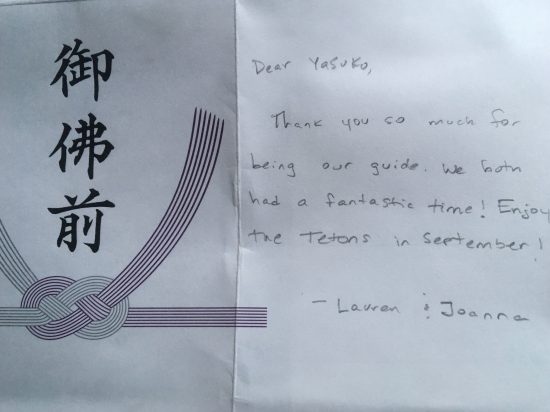 別れ際に「香典袋」に入ったお礼のチップを渡される・・・ とりあえず御霊前の袋にかなりビビる・・わたし。彼女たちはもちろんこの袋の意味もわからずコンビニで買った様子、ちゃんと説明すると相当びっくりしたました。(笑)