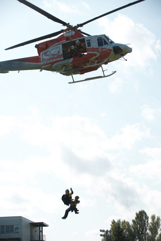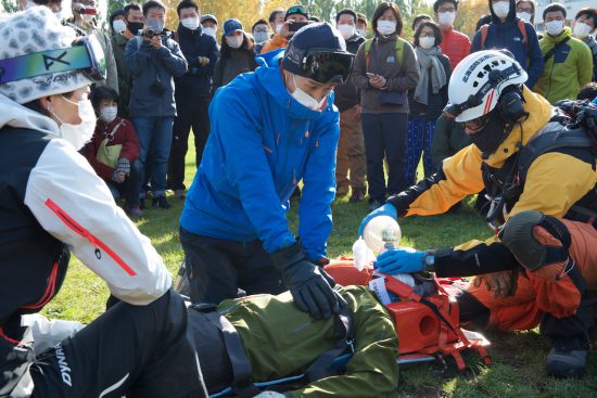 私は雪氷学会雪崩調査ガイド部門チームに所属しており、今回はこの実行委員,北海道防災航空隊との交渉係でした。当日まで幾度と打ち合わせ&訪問を重ね準備してこの日となりました。当日は快晴、準備した甲斐があり素晴らしい壇上でのシナリオ&野外実演となりました。