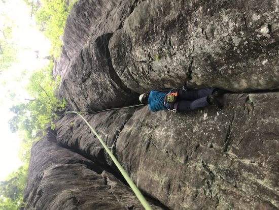 クライミングもスタートです。今日は愛別にある「石垣山」岩に縦に入る溝(クラック)に手と足を挟み登るちょっと独特のスタイル。 一年ぶりのクラックにゲストさんも苦戦気味でした