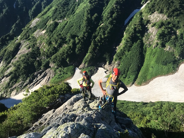 北アルプス 岩と雪の殿堂「剣岳」今回は源次郎尾根バリエーションルートのクライムミングルートから剱岳ピークへゲストさんを案内してきました。ショートロープクライミングから30mの懸垂下降をへて山頂を踏んできました。一般の別山尾根と違うバリエーションルートは達成感も抜群!本州も夏が本気をだし、富山も劔も暑い・・汗だくで木登り&岩稜登りです、登頂して劔沢小屋到着したら真っ先に「ビール!!」でした。晴れ女と晴れ男のゲストさん  完璧な天気と内容でしたね!ありがとうございました。また来年の企みを用意しておきます!