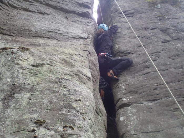 ボルトや既存のプロテクションが設置させていないので自分でナチプロ (ナチュラルプロテクション)でつくり登るスタイル。好き嫌いが分かれるクライミングです。今回は初めての方と経験有りの2名の女性ゲスト、雨も後半降るなかフィンガーサイズからオフィスズまでクラックスタイルを登っていただきました。お疲れサマンサ。
